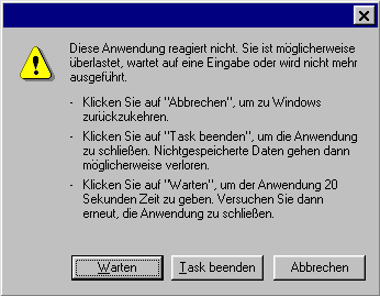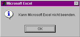 Doch, auch das ansonsten recht stabile Windows NT 4.0 kriegt man zum straucheln. Netzwerkzugriffsprobleme sind unschön, also besser Rechner runterfahren und ab nach Hause. Aber was ist das? Die oben nachgestellte Meldung erschien nach Aufruf von "Herunterfahren". Es zählt ein Timer von 30 auf Null runter! Die einzige Eingriffsmöglichkeit wäre ein Klick auf OK gewesen. Versuchen wir uns die Situation praxisnah vorzustellen. Schnell zum Telefon gegriffen: "Hallo Admin? Stichwort 51. Schnell, speichern Sie mein Profil! Sie haben noch 23 Sekunden Zeit!" Platz 4: "kann nicht beenden"